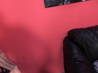 Horny redhead kneels for a blowjob and gets her shaved cunt fucked hard on the sofa