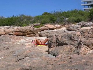 Amazing busty brunette slut doing blowjob outdoor